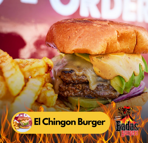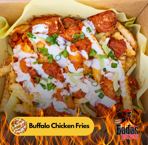 Badas Burgers Food Truck: Burgers, chicken sandwiches, smoked pulled sandwiches, fries, buffalo chicken fries, and sweet potato fries.